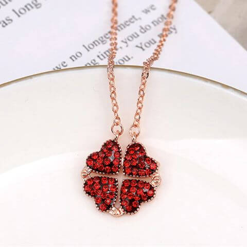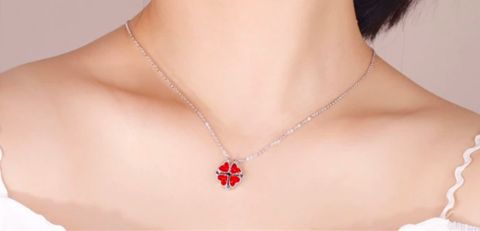 Το κολιέ αλλάζει εύκολα σχήμα και από τετράφυλλο τριφύλλι μετατρέπεται σε σειρά από καρδιές, ενώ κάθε πλευρά έχει και διαφορετικό χρώμα: η μία πλευρά είναι μπλε και η άλλη κόκκινη!